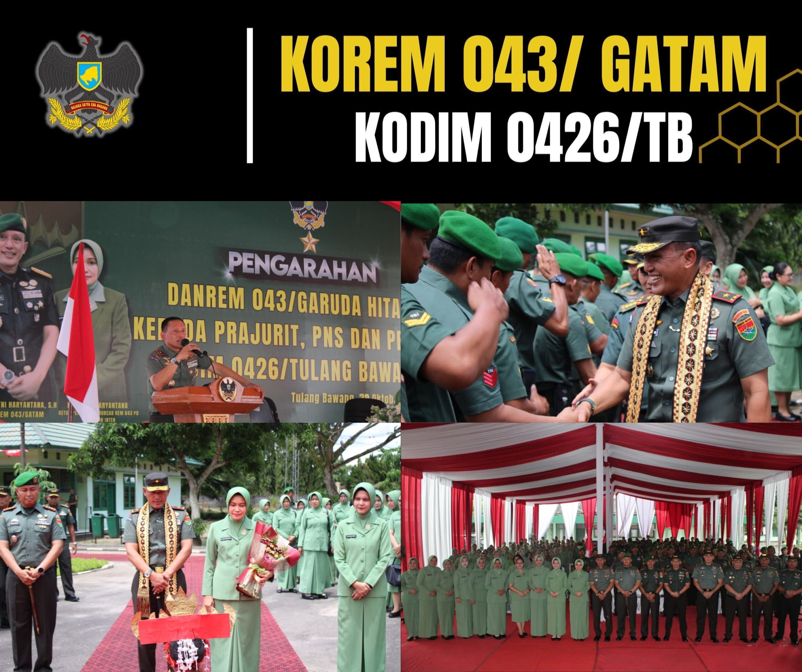 KODIM 0426/TB – – Menggala (Tulang Bawang) — Komandan Korem 043/Garuda Hitam, Brigjen TNI Haryantana, S.H., melaksanakan kunjungan kerja ke Makodim 0426 Tulang Bawang yang berlokasi di Jl. Lintas Timur Sumatera KM 113, Kampung Bujung Tenuk, Kecamatan Menggala, Kabupaten Tulang Bawang, pada Kamis, 30 Oktober 2025.