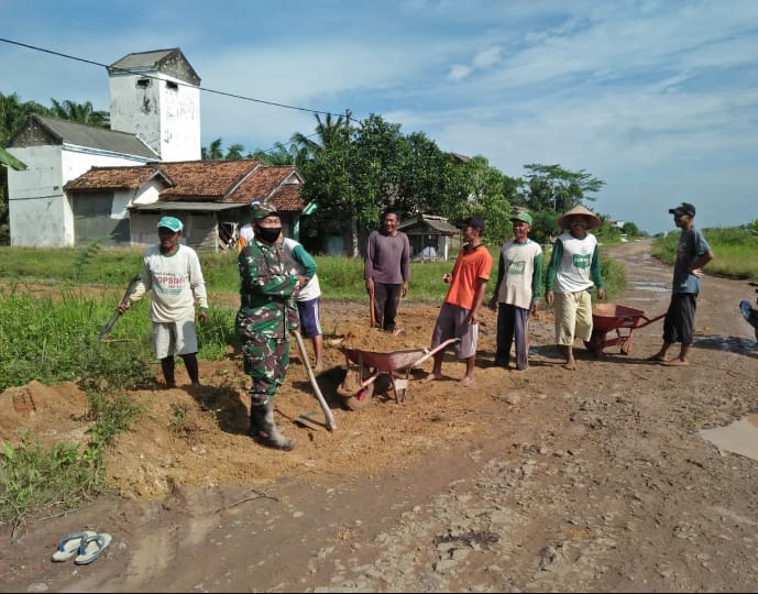KODIM 0426/TB- RAWAJITU UTARA–Bertempat di Jalan Desa TR.02 Desa Panggung Jaya, Kecamatan Rawajitu Utara, Kabupaten Mesuji, Babinsa (Bintara Pembina Desa) Serka Slamet melaksanakan gotong royong bersama warga menimbun jalan, Selasa (16/02/2020)