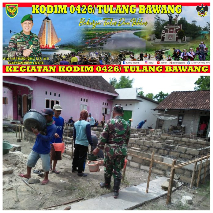 KODIM 0426 TB- Rawajitu Utara (Mesuji) — Babinsa Koramil 426-03 Rawajitu Kodim 0426 Tulang Bawang Serma Slamet Riyadi guna terciptanya sinergitas TNI bersama Rakyat, melaksanakan karya bakti dalam hal ini membantu pembuatan pondasi untuk pembangunan rumah milik Bapak Widodo Didesa Panggung Jaya, Kecamatan Rawajitu Utara, Kabupaten Mesuji, Kamis 06 April 2023.