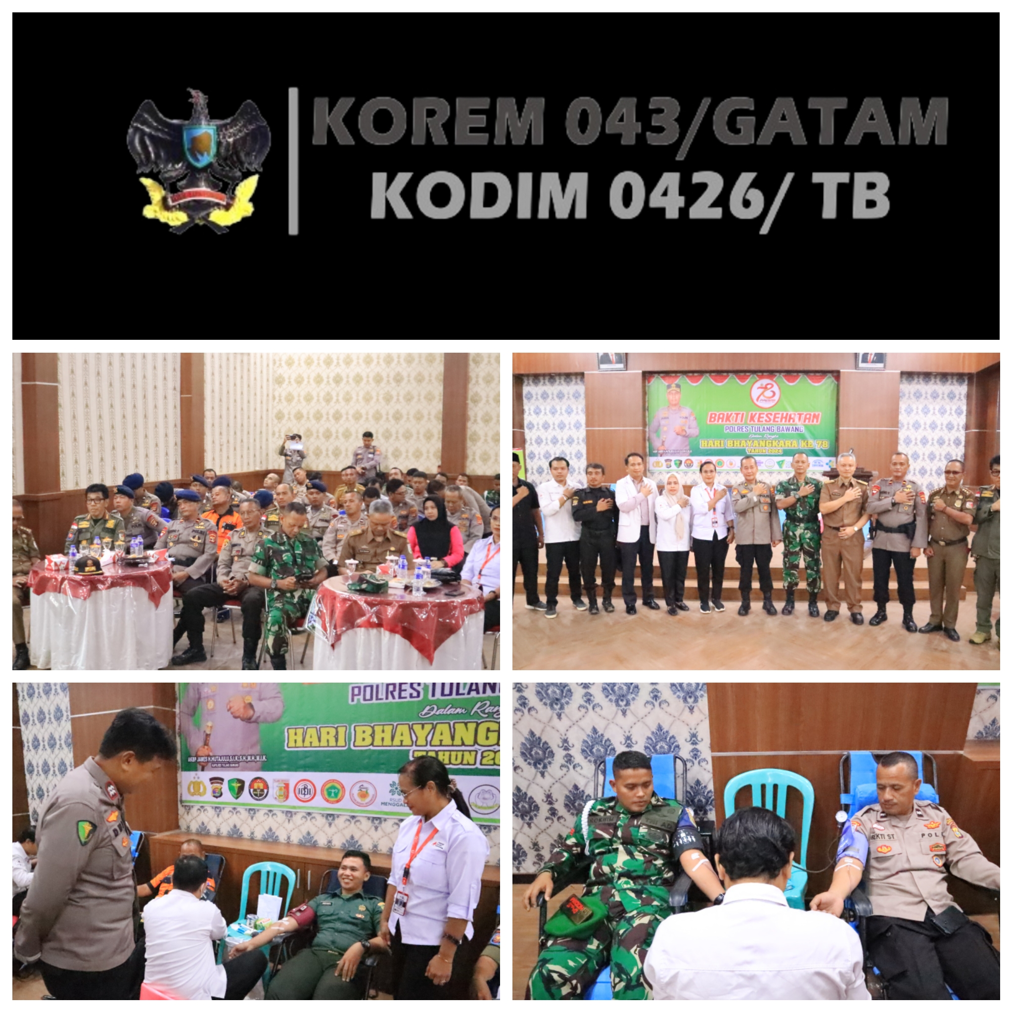 KODIM 0426/TB-Menggala (Tulang Bawang) — Dalam rangka memperingati HUT Bhayangkara Ke-78 Pabung Kapten Inf Arif Affuan, beserta anggota Kodim 0426 Tulang Bawang turut serta mengikuti kegiatan donor darah yang diselenggarakan oleh Polres Tulang Bawang, bertempat di Aula Wira Satya Polres Tulang Bawang, Selasa 11 Juni 2024.