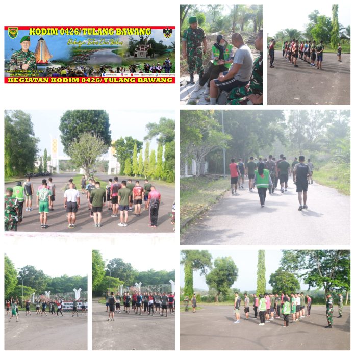 KODIM 0426/TB- Menggala (Tulang Bawang) — Upaya menjaga kebugaran jasmani, Kodim 0426 Tulang Bawang, gelar olahraga bersama yang di laksanakan di Gapura Pemda Baru Tiuh Tohow. Kecamatan Menggala, Kabupaten Tulang Bawang, Selasa, 28 November 2023.