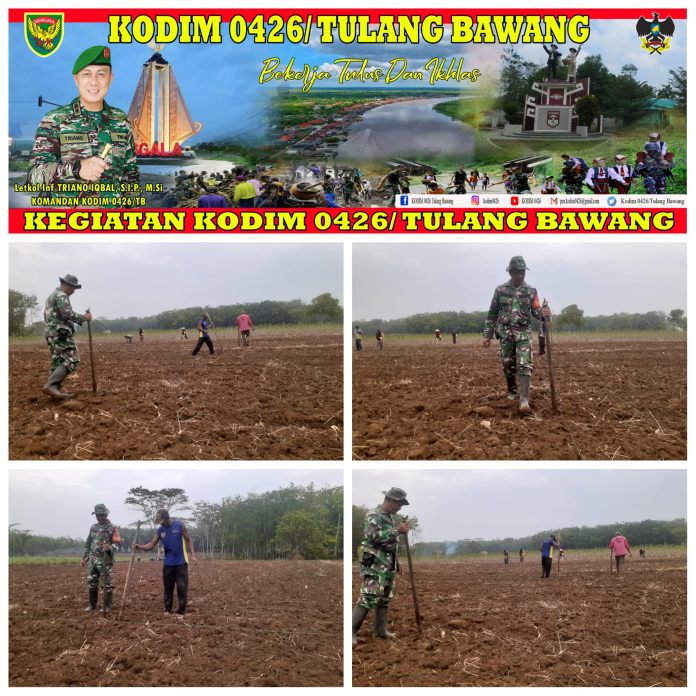 KODIM 0426/TB-Banjar Agung (Tulang Bawang) — Babinsa Koramil 426-04 Banjar Agung, Kodim 0426 Tulang Bawang, Serka Supriyono membantu masyarakat menjaga ketahanan pangan petani saat melakukan penanaman jagung di desa binaannya, di Kampung Dwi Warga Tunggal, Kecamatan Banjar Agung, Kabupaten Tulang Bawang, Minggu 26 November 2023.