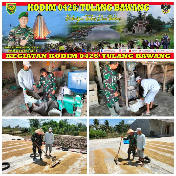 KODIM 0426/TB- (Mesuji) — Babinsa Koramil 426-01/SP Sertu Hendriyanto melaksanakan kegiatan monitoring ke tempat pengilingan padi milik Bapak Suwarno di Desa Tanjung Serayan, Kec. Mesuji , Kab. Mesuji. Kamis (13/10/2023).