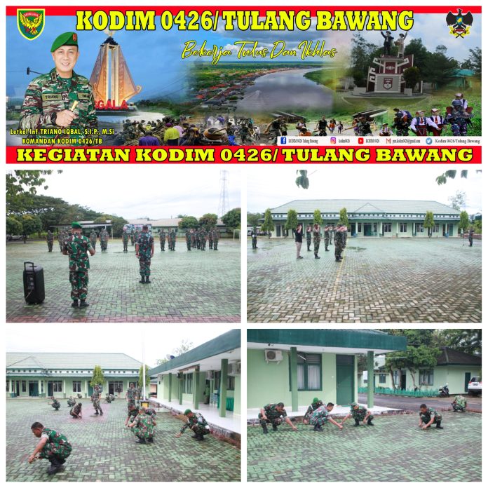 KODIM 0426/TB- Menggala (Tulang Bawang) — Jajaran Kodim 0426 Tulang Bawang melaksanakan apel pagi dilapangan Pamungkas Jln. Lintas Timur Sumatera, Km 113 Kampung Bujung Tenuk, Kecamatan Menggala, Kabupaten Tulang Bawang, Senin 10 April 2023.