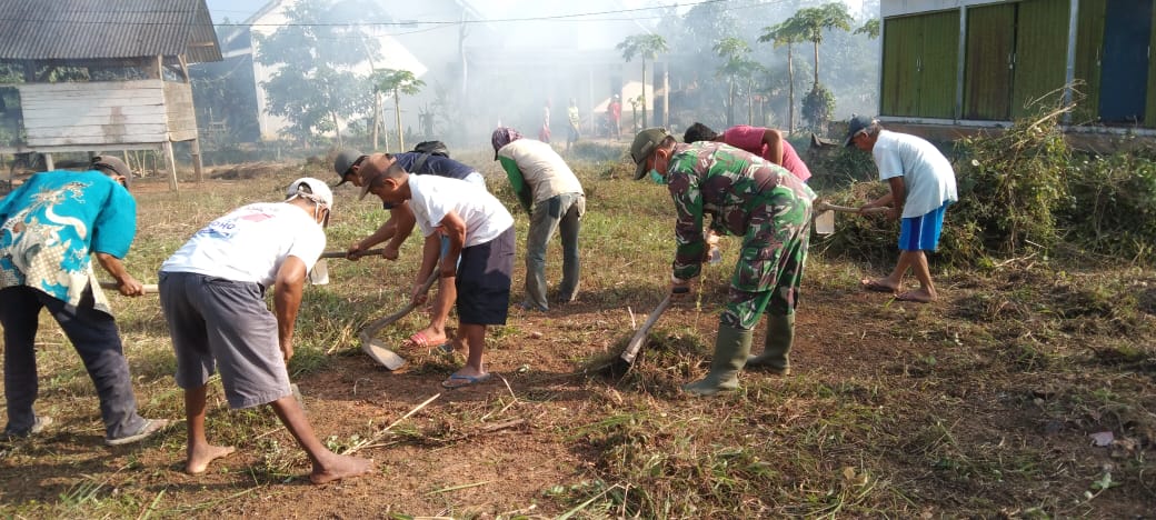 KODIM 0426/TB- MESUJI- Bintara Pembina Desa (Babinsa) Koramil 426-01 Simpang Pematang Kodim 0426 Tulang Bawang, bersama warga RK 05 Desa Bujung Burung, Kecamatan Tanjung Raya, Melaksanakan Kegiatan Jum’at bersih pembersihan seputar Balai Desa, Jum’at (6/8/2021)
