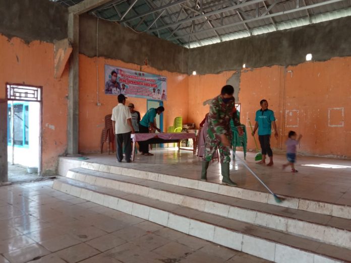 KODIM 0426/TB- RAWAJITU UTARA- Sertu Rafinel, Babinsa Desa Sidang Way Puji, Kecamatan Rawajitu Utara, Kabupaten Mesuji, bersama perangkat desa bahu membahu membersihkan Balai desa setempat, Kamis 3 Juni 2021.