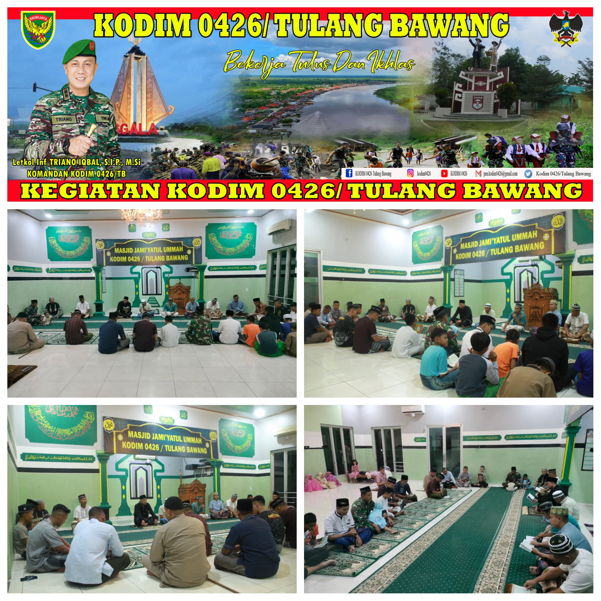 KODIM 0426/TB- Menggala (Tulang Bawang) – Dalam rangka meningkatkan keimanan dan ketaqwaan kepada Allah SWT, Anggota Kodim 0426 Tulang Bawang melaksanakan Yasinan setiap malam Jumat yang dilaksanakan di Masjid Jamiyatul Ummah Makodim., Jln. Lintas Timur Sumatra, Km. 113, Kampung Bujung Tenuk, Kecamatan Menggala, Kabupaten Tulang Bawang, Kamis Malam 16 Maret 2023.