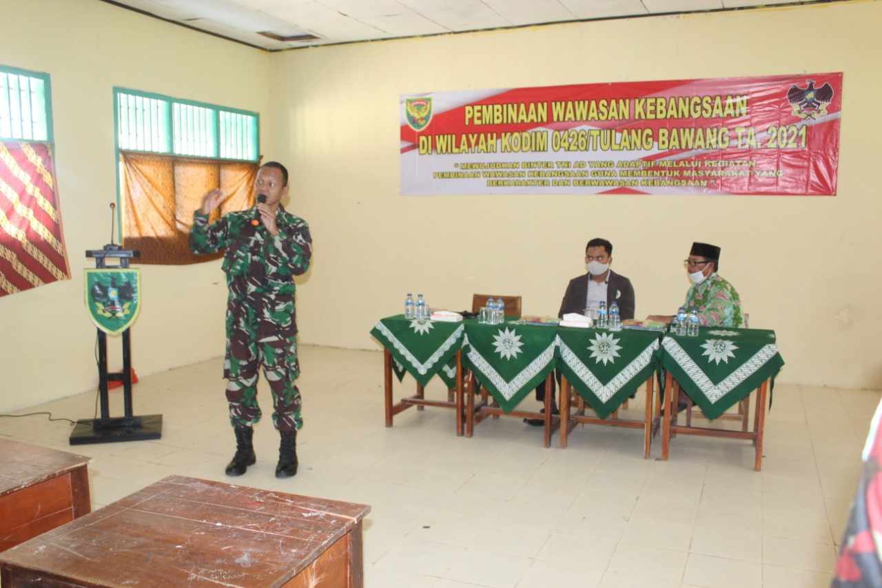 KODIM 0426/TB- Kodim 0426 Tulang Bawang melalui Pasi Teritorial Kapten Inf Arif Afuan, memberikan pembinaan wawasan kebangsaan kepada siswa siswi SMA Muhamadiyah I Menggala, Kabupaten Tulang Bawang, Jumat 19 Maret 2021.