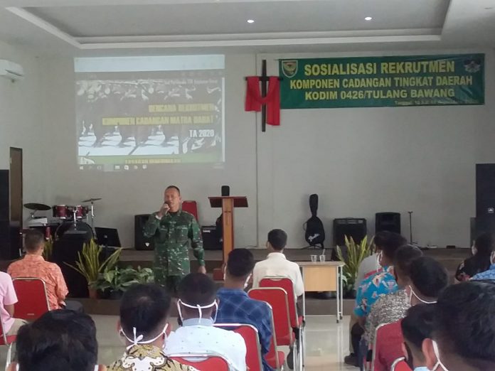 KODIM 0426/TB- TULANG BAWANG– Kodim 0426 Tulang Bawang mensosialisasikan program Kemenhan (Kementerian Pertahanan) tentang rekrumen Komponen Cadangan di STT (Sekolah Tinggi Teologia) Mawar Saron Kabupaten Tulang Bawang, Senin (10/08/2020)