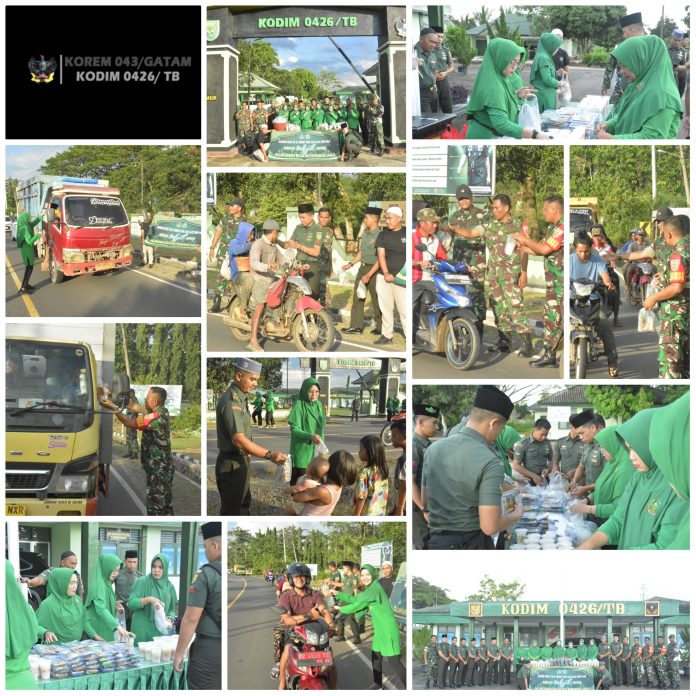 KODIM 0426/TB — Menggala (Tulang Bawang) — Kodim 0426 Tulang Bawang, bersama Persit Kartika Chandra Kirana Cabang XLlX Dim 0426, Koorcab Rem 043 Gatam PD ll Sriwijaya, berbagi takjil gratis kepada warga menjelang berbuka puasa, bertempat di depan Makodim, Jl Lintas Timur Sumatera, KM 113, Kampung Bujung Tenuk, Kecamatan Menggala, Kabupaten Tulang Bawang, Rabu Sore 12 Maret 2025.