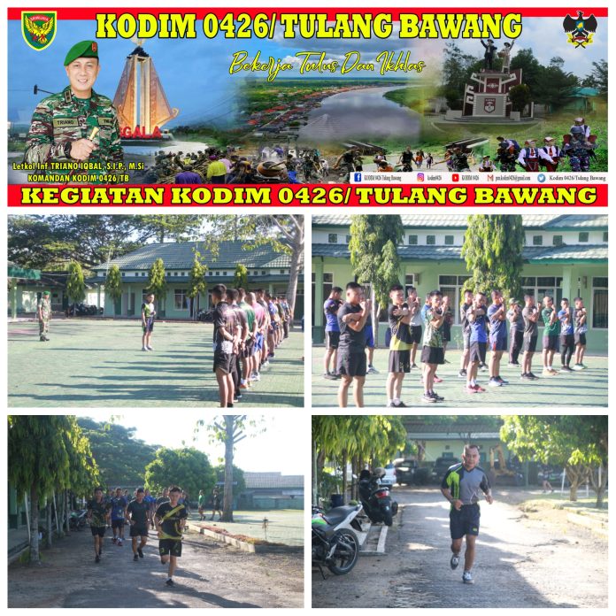 KODIM 0426/TB-Menggala (Tulang Bawang) — Personel Kodim 0426 Tulang Bawang, Laksanakan Apel Pagi Di Lanjutkan Lari Aerobik, sebagai Prajurit TNI AD dituntut untuk tetap bugar secara fisik, agar tetap bisa melaksanakan tugas dan kewajibannya sebagai Satuan Kewilayahan.