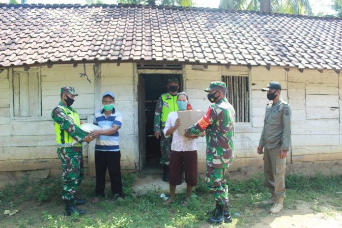 KODIM 0426/TB- MESUJI- Bintara Pembina Desa (Babinsa) di Kabupaten Mesuji berikan sembako kepada masyarakat yang kurang mampu dan terdampak pendemi Coronavirus disease 2019 (Covid 19) atau Corona.