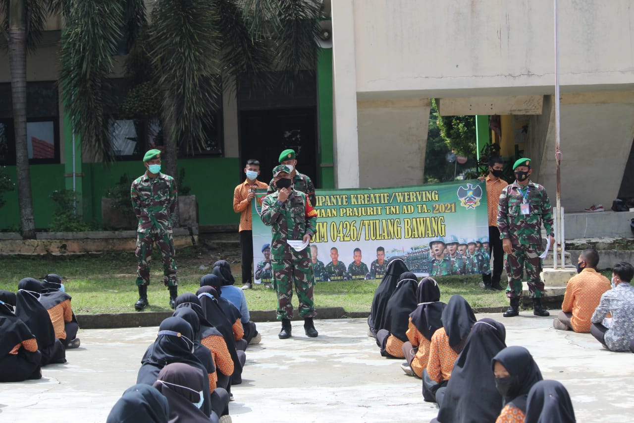 KODIM 0426/TB- TULANG BAWANG- Melalui Bintara Tinggi Staf Personil Kodim 0426 Tulang Bawang Werving Kreatif penerimaan calon prajurit TNI- AD digelar di Sekolah- sekolah lanjutan tingkat atas (SLTA sederajat) di wilayah binaan.