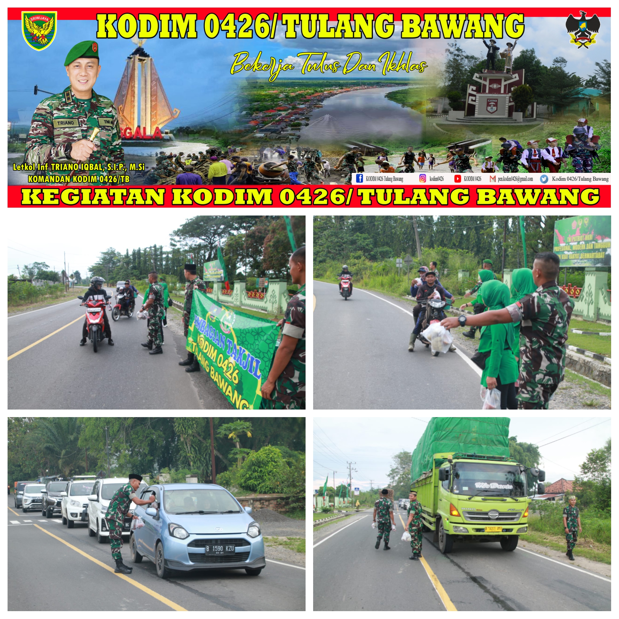 Bersama jajaran Kodim 0426 Tulang Bawang, Dandim membagikan takjil gratis kepada pengguna jalan raya yang melintas di depan Makodim Jln. Lintas Timur Sumatera, Km 113, Kampung Bujung Tenuk, Kecamatan Menggala, Kabupaten Tulang Bawang, Kamis 06 April 2023.