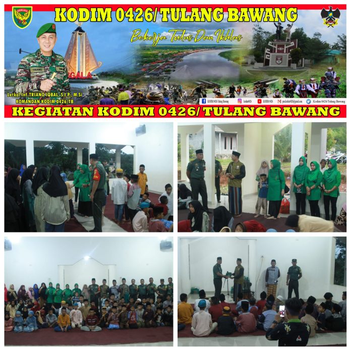 KODIM 0426/TB- Menggala (Tulang Bawang) — Komandan Kodim 0426 Tulang Bawang Letkol Inf Triano Iqbal, S.I.P., M.Si, didampingi langsung Ketua Persit Kartika Chandra Kirana Cabang XLIX Ny. Santy Triano Iqbal bagikan takjil ke Ponpes Riyadussholin Al Hannan, Kamis malam 30 Maret 2023.