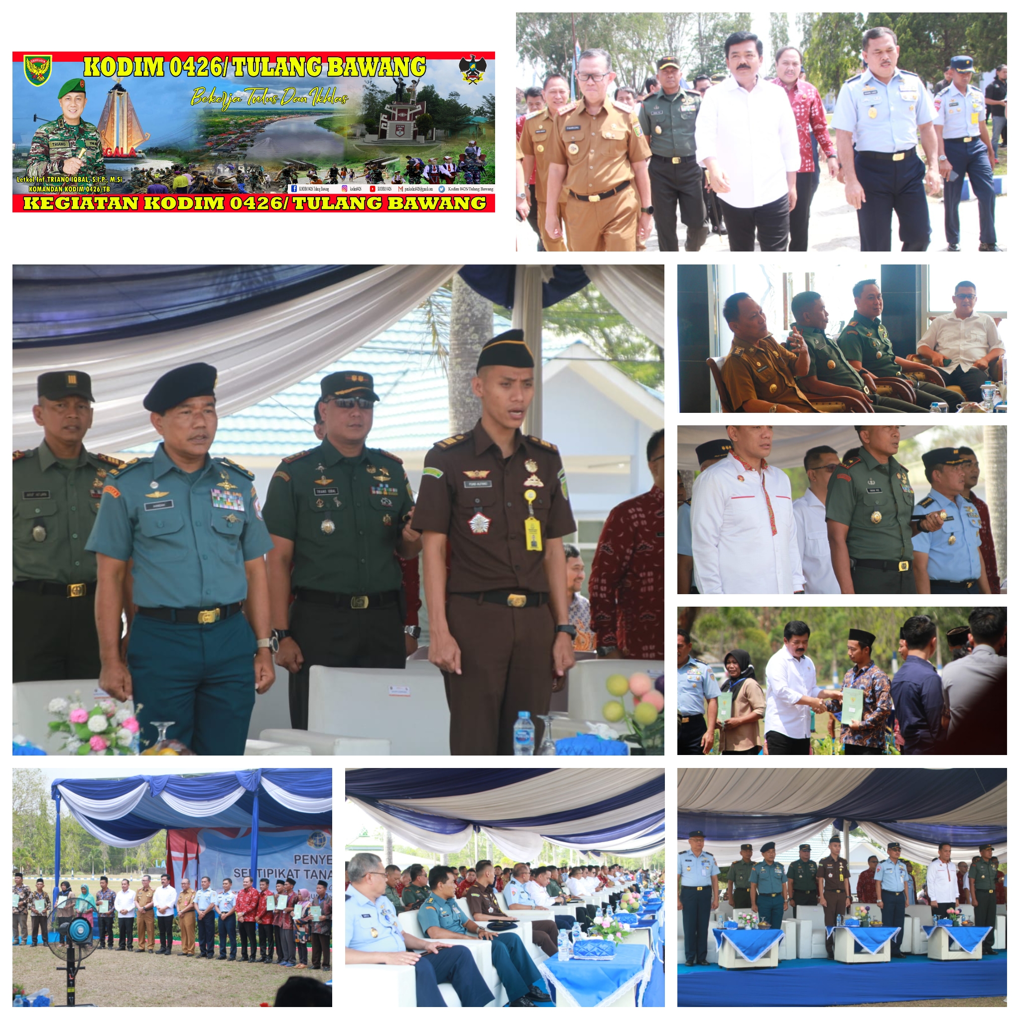 KODIM 0426/TB-Menggala (Tulang Bawang) — Komandan Kodim 0426 Tulang Bawang, Letkol Inf Triano Iqbal, S.I.P., M.S.i, menghadiri penyerahan Sertifikat Tanah oleh Menteri Agraria dan Tat Ruang/Kepala Badan Pertahanan Nasional (ATR/BPN) Hadi Tjahjanto kepada masyarakat Lampung Utara di Lanud Pangeran M. Bun Yamin, Kampung Astra Kasetra, Kecamatan Menggala, Kabupaten Tulang Bawang, Selasa 28 November 2023.