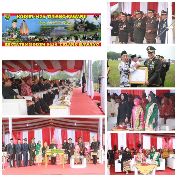 KODIM 0426/TB-Mesuji (Mesuji) — Komandan Kodim 0426 Tulang Bawang Letkol Inf Triano Iqbal, S.I.P., M.Si., Didampingi Ketua Persit KCK Cabang XLIX Dim 0426/TB Ny. Shanty Triano Iqbal., Menghadiri Upacara peringatan HUT Kabupaten Mesuji Ke- 15, HUT PGRI Ke 78 Dan HUT KORPRI Ke 52 Tahun bertempat di lapangan Desa Mekar Jaya, Kecamatan Tanjung Raya, Kabupaten Mesuji, Minggu 26 November 2023.