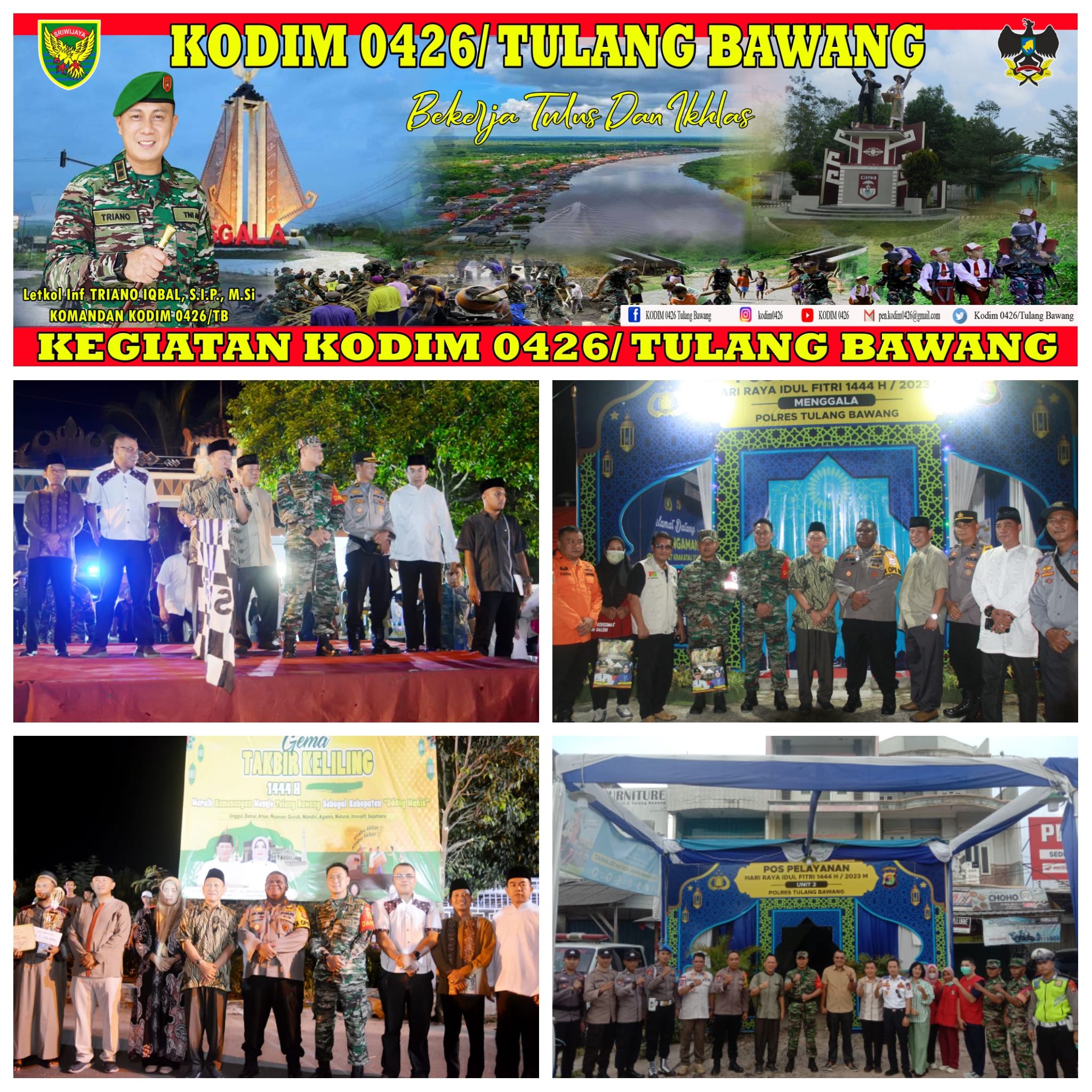 KODIM 0426/TB- Menggala (Tulang Bawang) Komandan Kodim 0426 Tulang Bawang Letkol Inf Triano Iqbal, S.I.P., M.Si, melaksanakan patroli Gabungan Pengamanan Malam Takbir Hari Raya Idul Fitri 1444 H Tahun 2023. Jum’at malam 21 April 2023.