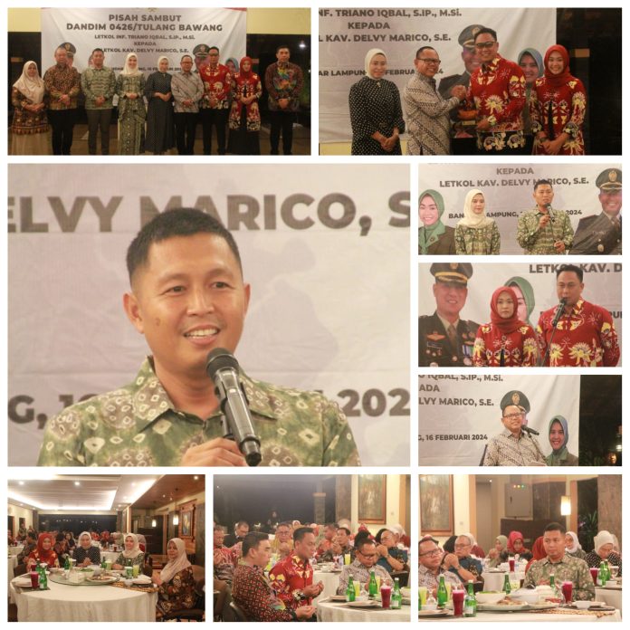 Acara pisah sambut antara Letkol Inf Triano Iqbal, S.I.P., M.Si, dengan pejabat Dandim 0426 Letkol Kav Delvy Marico, S.E., M.I.P. Dilaksanakan di Taman Santap Rumah Kayu, Bandar Lampung, Jum’at 16 Februari 2024 pukul 20.00 Wib.