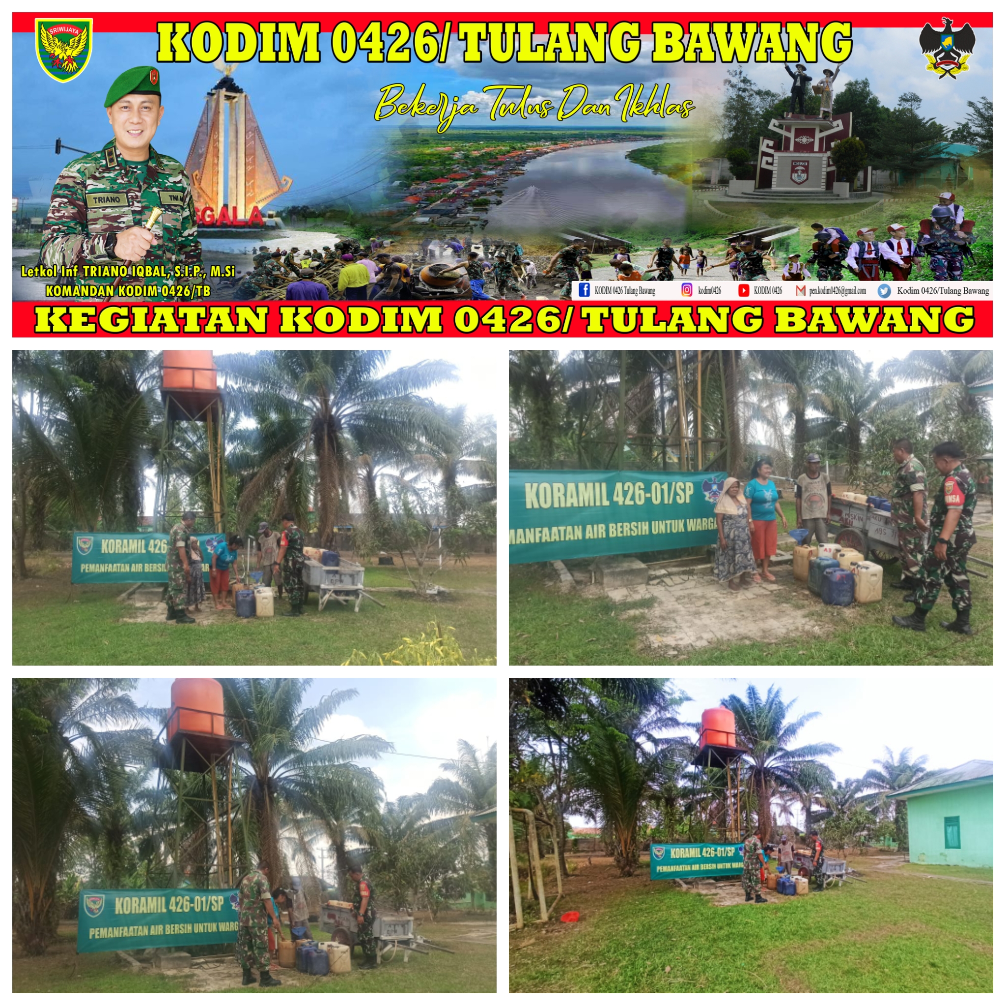 KODIM 0426/TB- Mesuji Koramil 426-01 Simpang Pematang, Kodim 0426 Tulang Bawang, sediakan air bersih bagi masyarakat, Selasa 19 September 2023.