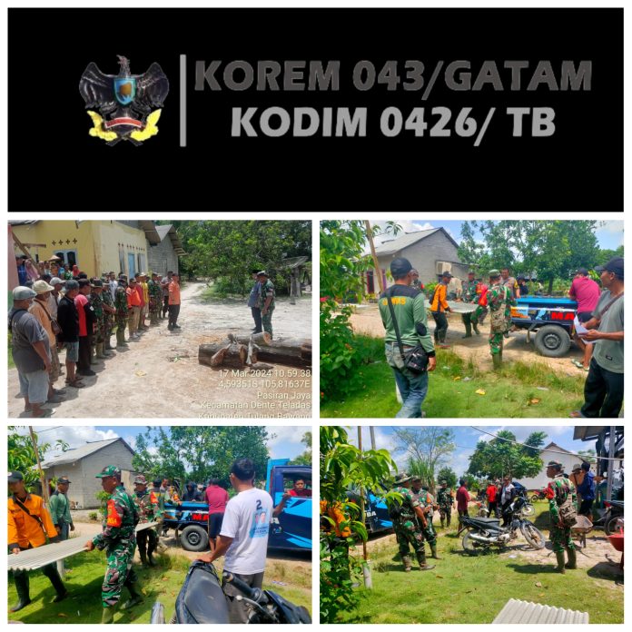 KODIM 0426/TB — Anggota Koramil 426-02 Menggala dipimpin langsung oleh Komandan Koramil Lettu Inf Yogo Utomo bergerak cepat membantu warga masyarakat Kampung Pasiran Jaya, Kecamatan Dente Teladas, Kabupaten Tulang Bawang paska kejadian angin puting beliung Minggu 17 Maret 2024.