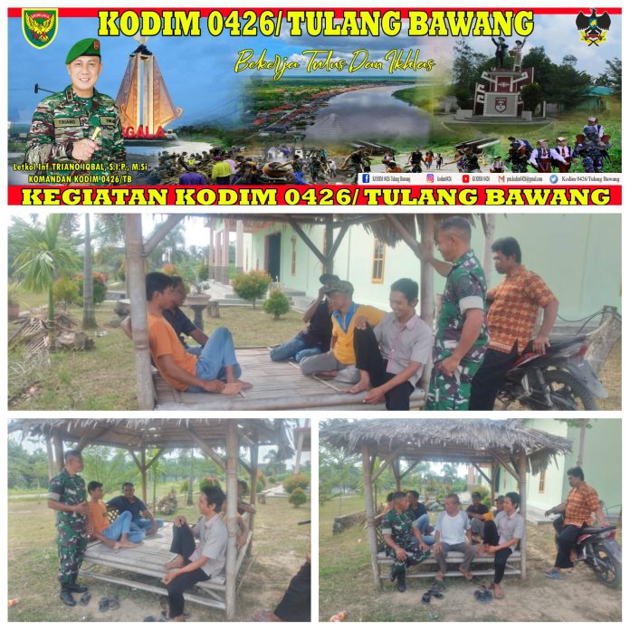 KODIM 0426/TB- Banjar Margo (Tulang Bawang) — Babinsa Koramil 426-04 Banjar Agung, Kodim 0426 Tulang Bawang, Serka Mulyono, lakukan kegiatan Komunikasi Sosial di Kampung Catur Karya Buana Jaya, Kecamatan Banjar Margo, Kabupaten Tulang Bawang, Sabtu 14 Oktober 2023.