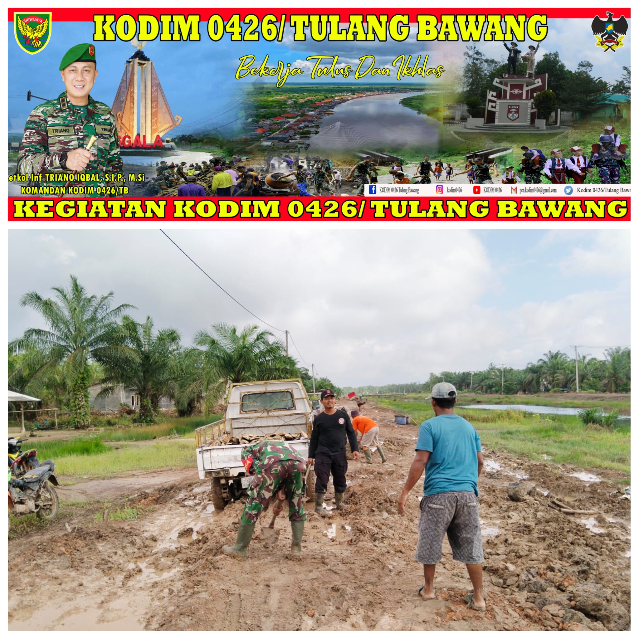 KODIM 0426/TB- Rawa Pitu (Tulang Bawang) – Serda Jumono Babinsa Koramil 426-05 Penawar Aji Kodim 0426 Tulang Bawang, Melaksanakan Gotong Royong bersama warga binaan, memperbaiki jalan yang rusak di Kampung Panggung Jaya, Kecamatan Rawa Pitu, Kabupaten Tulang Bawang, Minggu 12 Maret 2023.
