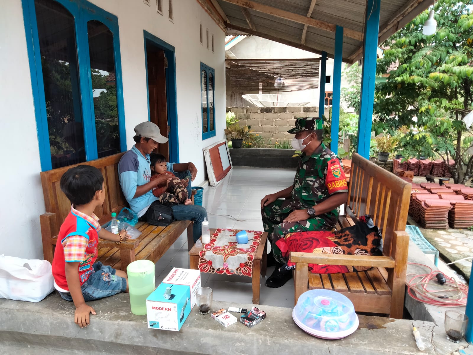 KODIM 0426/TB- Sertu Winarno, Babinsa Kampung Wonorejo, Kecamatan Penawar Aji, Kabupaten Tulang Bawang melaksanakan kegiatan komunikasi sosial di kediaman Santo, warga setempat untuk menyampaikan secara langsung pentingnya menjaga protokol kesehatan, Sabtu 22 Januari 2022.