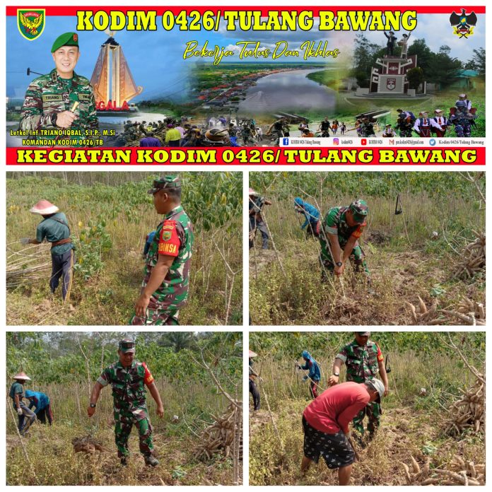 KODIM 0426/TB-Way Serdang–(Mesuji)– Mendukung Ketahanan Pangan Koptu Dedi Ariyanto Babinsa koramil 426-01/Simpang Pematang Melaksanakan pendampingan petani panen singkong di desa labuhan batin,Kecamatan War Serdang, Rabu (11/10/2023).