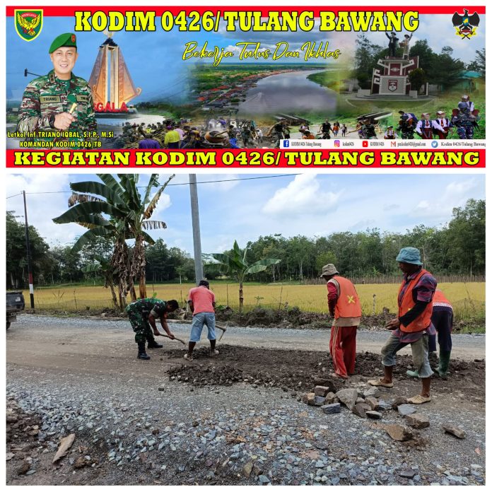 Gedung Aji (Tulang Bawang) – Babinsa Koramil 426-05 Penawar Aji, Kodim 0426 Tulang Bawang, Sertu Siswanto bersama Masyarakat melaksanakan gotong royong menimbun jalan yang berlubang bertempat di jalan penghubung Menuju Kampung Aji Jaya KNPI, Kecamatan Gedung Aji, Kabupaten Tulang Bawang, Sabtu (24/12/2022).