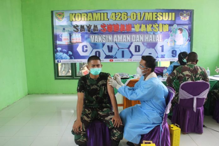 MESUJI- Seluruh anggota TNI AD di Kabupaten Mesuji menerima Vaksin Covid 19, Jum’at 5 Maret 2021.