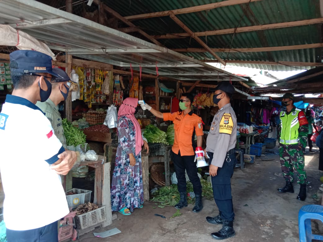 Operasi pendisiplinan protokol kesehatan juga memeriksa secara langsung mengukur suhu tubuh kepada para pedagang maupun pembeli yang berada di Pasar, mengecek dan mengingatkan penggunaan masker serta menghimbau agar selalu cuci tangan dan jaga jarak aman.