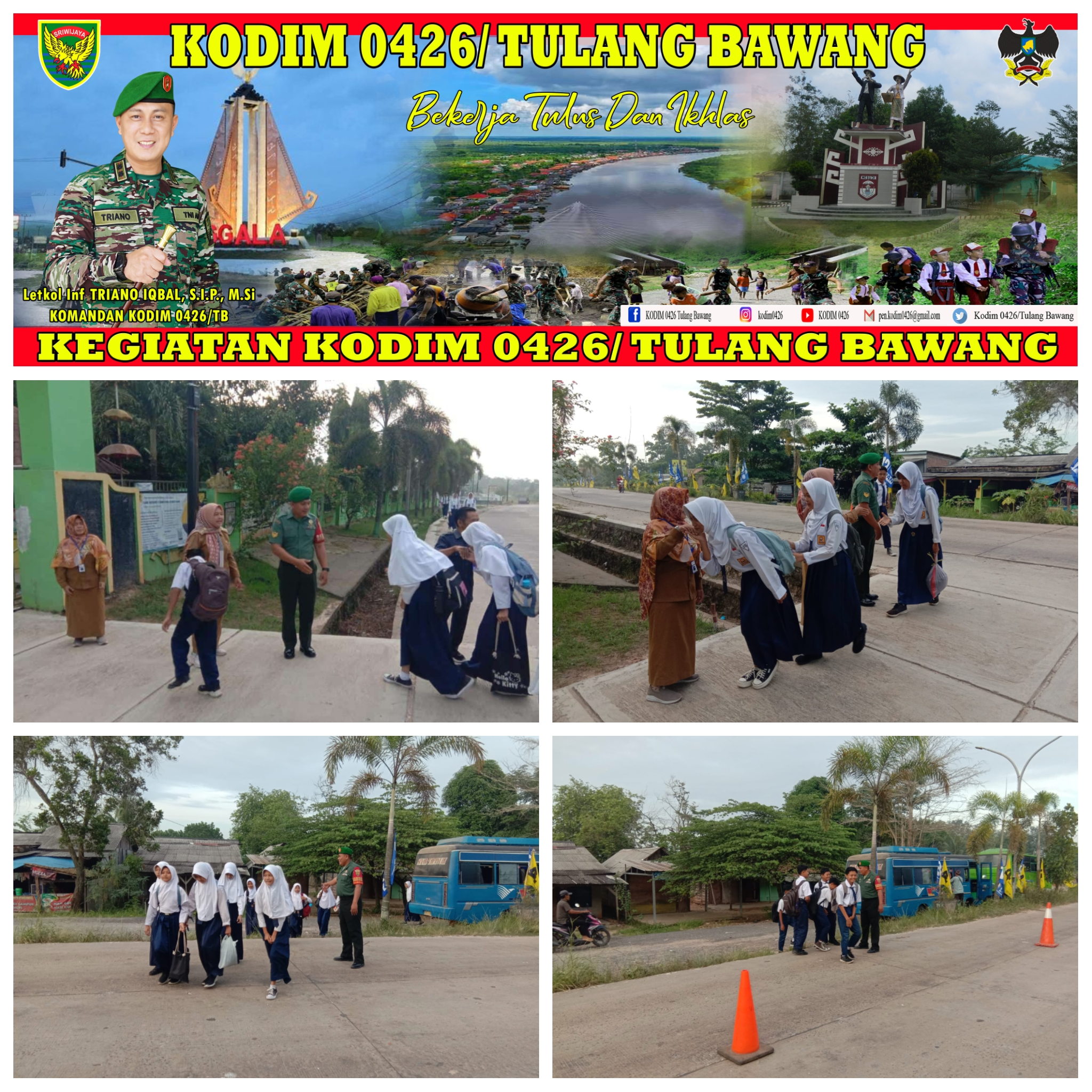 KODIM 0426/TB- Komandan Koramil 426-01 Simpang Pematang Mayor Inf Sutoto, melalui Serka Iman dan Sertu Najmi membantu menyebrangkan jalan anak-anak sekolah yang ingin pergi sekolah, Selasa 30 Mei 2023.