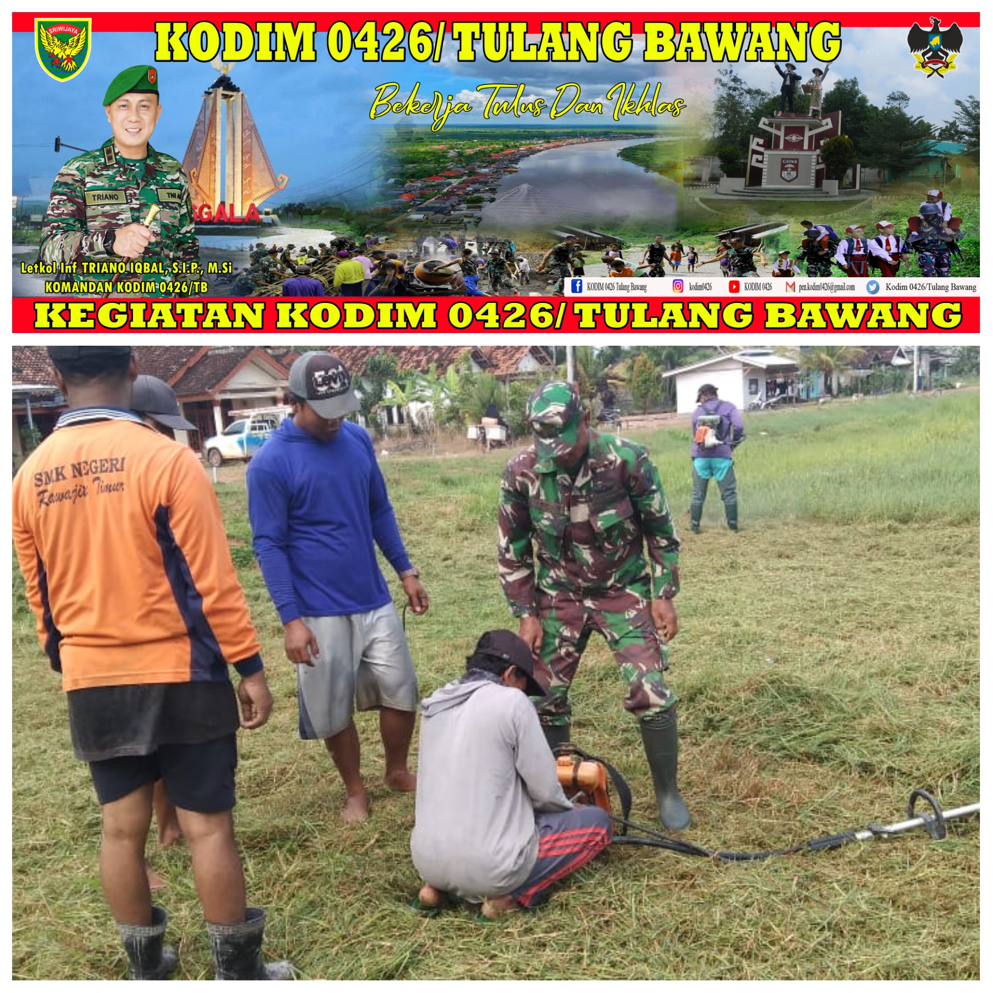 Masyarakat dengan dibantu Babinsa masuk ke lapangan membersihkan rumput-rumput liar yang sudah terlalu tinggi, dengan menggunakan mesin pemotong rumput.