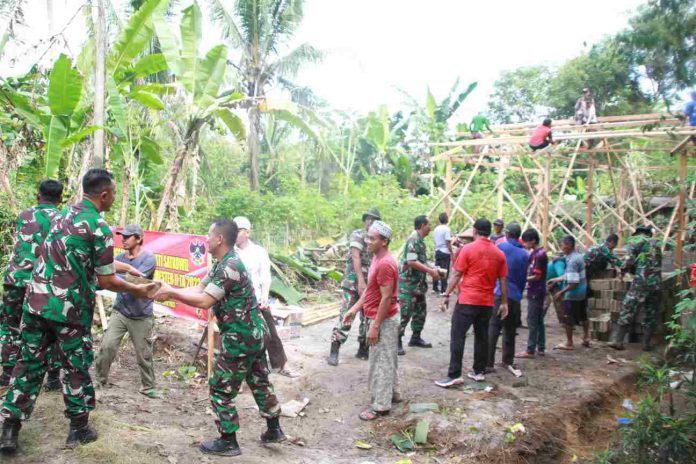 KODIM 0426/TB- Banjar Agung (Tulang Bawang) – Dalam rangka pengabdian TNI untuk rakyat, Koramil 426-04/Banjar Agung, Kodim 0426/Tulang Bawang, menggelar Program karya Bakti Satkowil TNI Ta.2022.Melaksanakan Bedah Rumah Tidak Layak Huni (RTLH) milik Sdri.Tanem RT 05 Rk 02 Kampung Moris Jaya, Kecamatan Banjar Agung, Kabupaten Tulang, Jumat (02/09/2022).