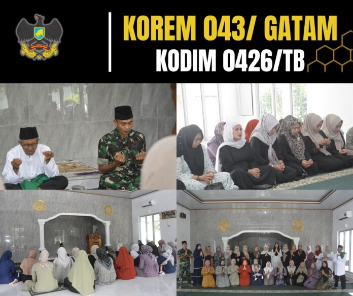 KODIM 0426/TB – – Menggala (Tulang Bawang) — Jajaran Persit Kartika Chandra Kirana (KCK) Cabang XLIX Dim 0426/Tulang Bawang, Koorcab Rem 043/Gatam PD XXI Radin Inten menggelar kegiatan doa bersama sebagai bentuk kepedulian dan solidaritas terhadap masyarakat yang tengah dilanda musibah bencana alam. Kegiatan ini dilaksanakan di Masjid Jamiyatul Ummah, Jalan Lintas Timur Sumatera KM 113, Kampung Bujung Tenuk, Kecamatan Menggala, Kabupaten Tulang Bawang, pada Rabu, 3 Desember 2025.