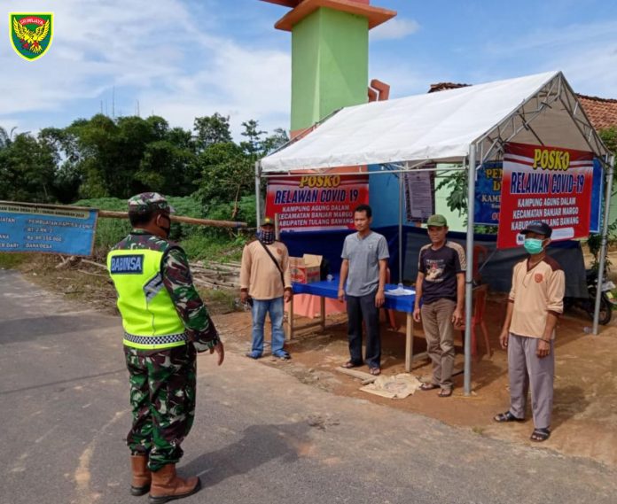 Sertu Ngadino, Bintara Pembina Desa (Babinsa) Koramil 426-02 Menggala, Kodim 0426 Tulang Bawang, Berikan pemahaman kepada relawan Covid-19 di Posko Mandiri Covid-19 Kampung Agung Dalam, Kecamatan Banjar Margo, Kabupaten Tulang Bawang.