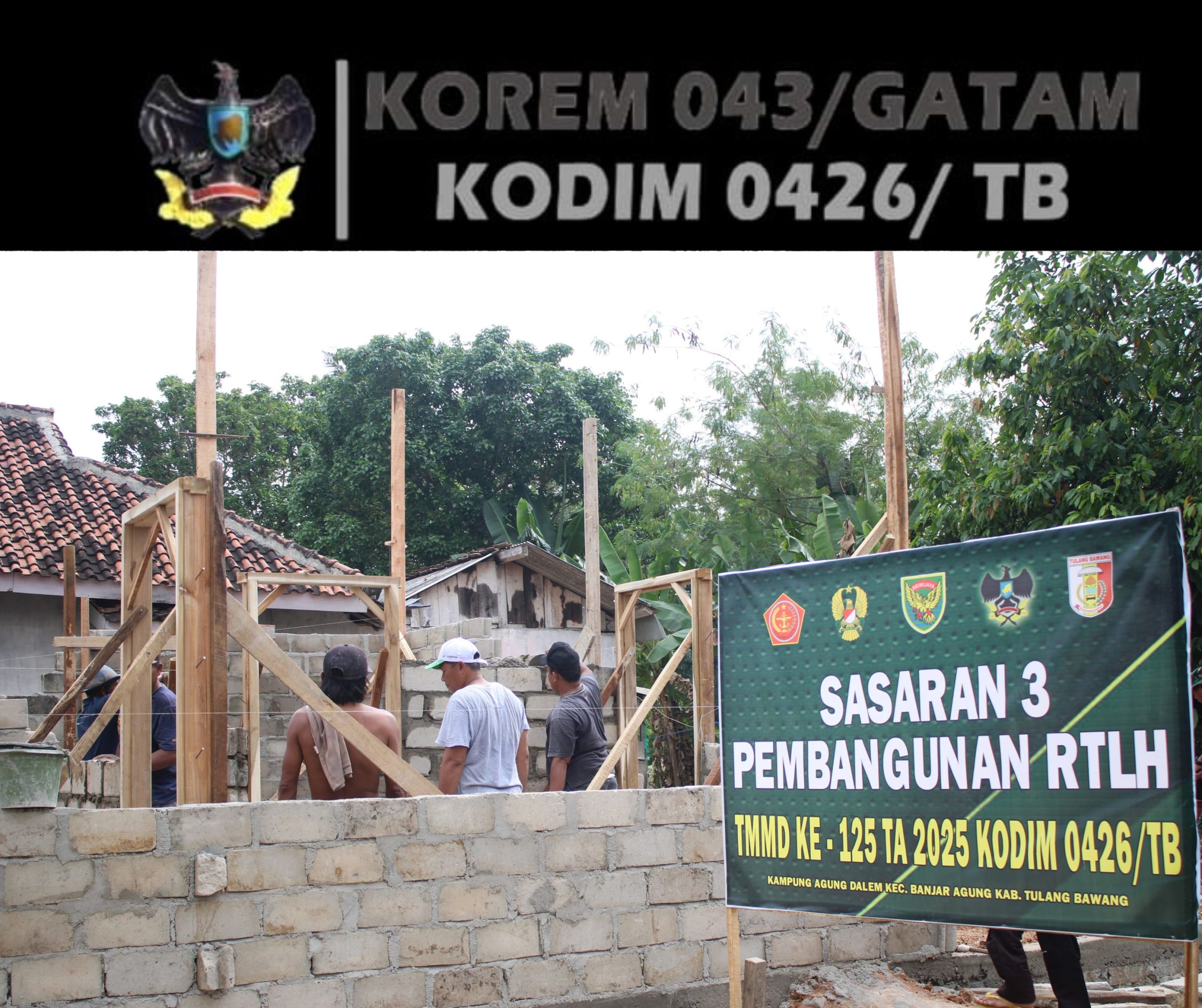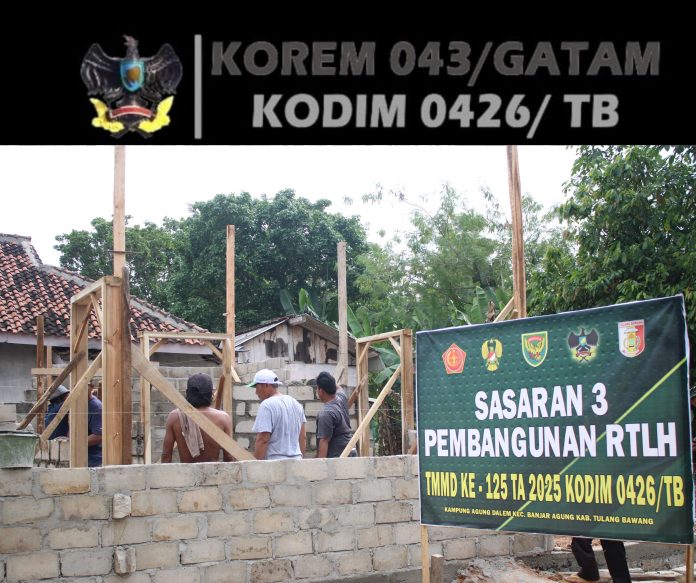 KODIM 0426/ TB – – Program TMMD ke-125 Kodim 0426/Tulang Bawang terus menunjukkan hasil nyata. Di sasaran 3, pembangunan Rumah Tidak Layak Huni (RTLH) di Kampung Agung Dalam, Kecamatan Banjar Agung, pada Rabu (30/07/2025), telah memasuki tahap lanjutan dengan fokus utama pada pemasangan bata dinding rumah.