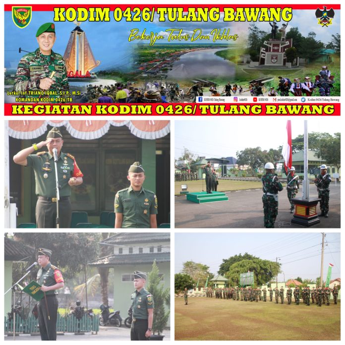 KODIM 0426/TB- Menggala (Tulang Bawang) — Komando Distrik Militer (Kodim) 0426 Tulang Bawang menggelar upacara pengibaran bendera (mingguan) di Lapangan Makodim di Jl. Lintas Timur Sumatera, KM. 113 Kampung Bujung Tenuk, Kecamatan Menggala, Kabupaten Tulang Bawang, Senin 28 Agustus 2023.