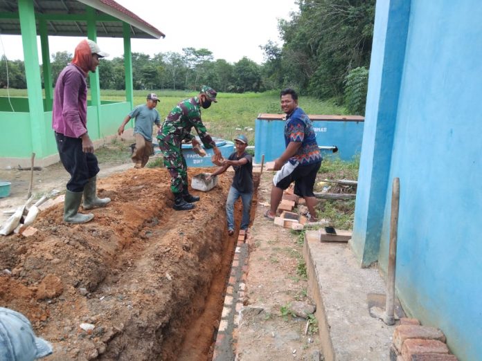 KODIM 0426/TB- MESUJI- Serda Suroso, Babinsa Desa Adi Luhur, Kecamatan Panca Jaya, Mesuji terus tumbuh kembangkan gairah bergotong royong ditubuh masyarakat binaannya, Sabtu 16 Januari 2021.