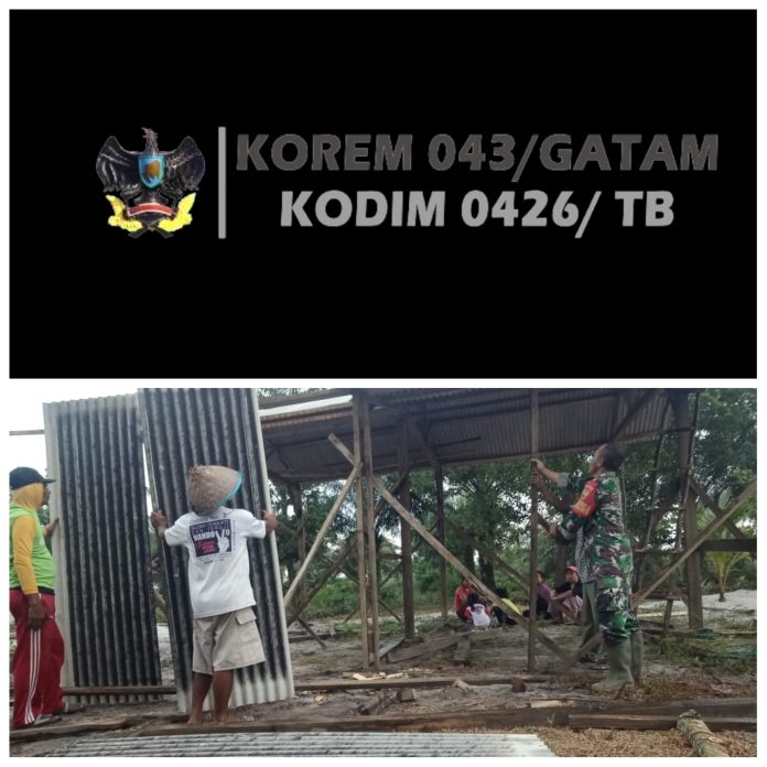 KODIM 0426/TB-(Menggala) — Babinsa koramil 426-02/MGL Serka Hambali Membantu Warga Yang Sedang Membangun Rumah Bapak Sugiman Warga Kp. Kekatung Kec. Dente Teladas Kab. Tulang Bawang, Minggu(30/06/2024). ”