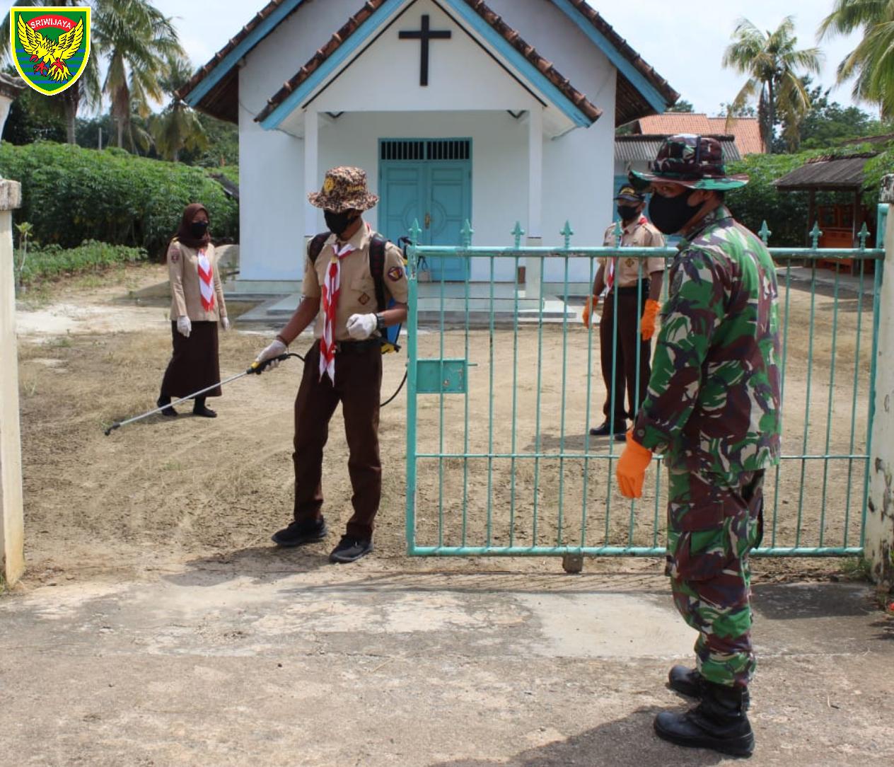 KODIM 0426/TB – TULANG BAWANG– Generasi muda bangsa yang tergabung dalam Saka Wira Kartika Kodim 0426, melaksanakan Bakti Saka penyemprotan tempat fasilitas umum guna mencegah penularan atau memutus rantai penularan Coronavirus disease 2019 (Covid-19) di Kecamatan Menggala, Kabupaten Tulang Bawang, Kamis (23-04-2020)