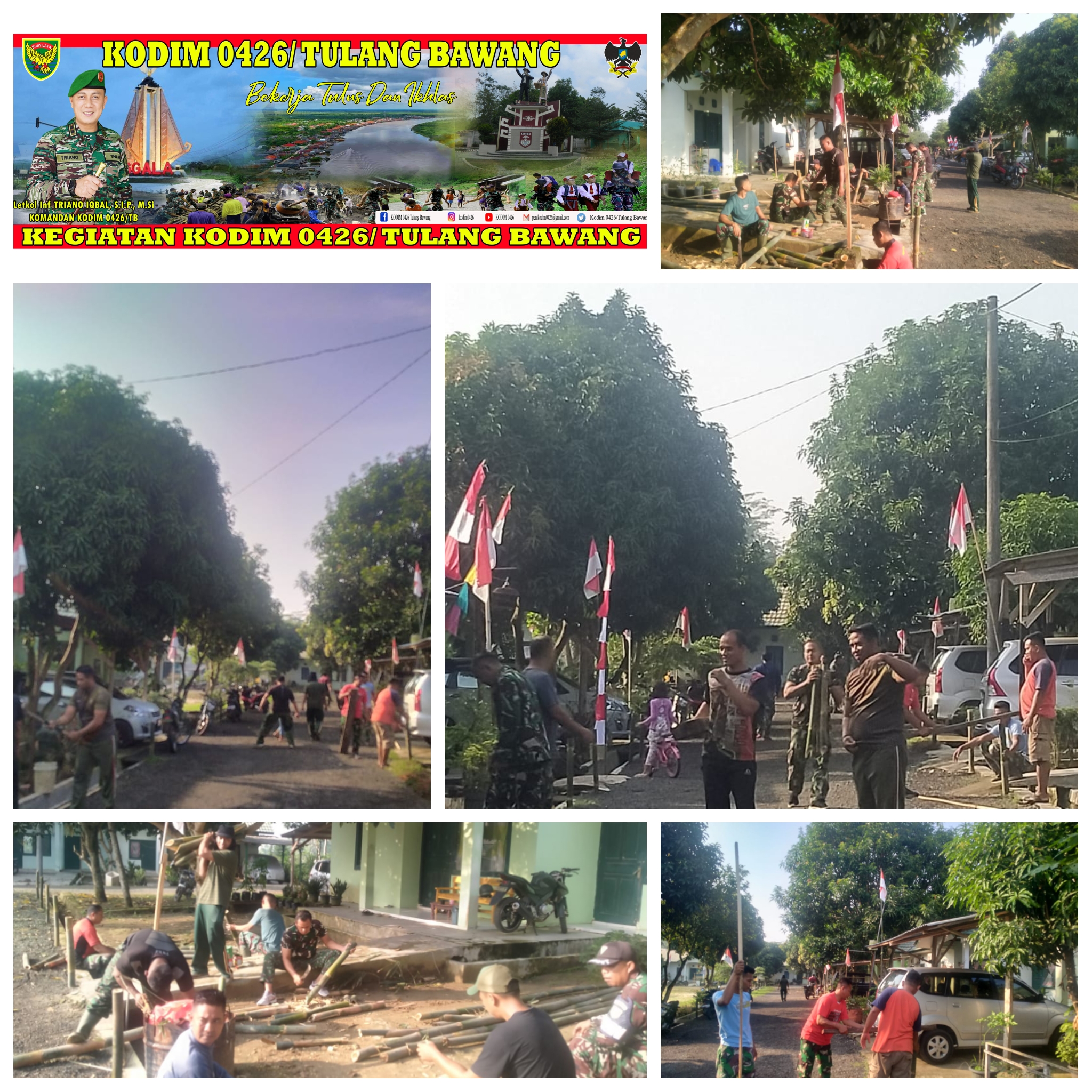 KODIM 0426/TB- Menggala (Tulang Bawang) — Kodim 0426 Tulang Bawang siapkan pangkalan dalam rangka menyambut HUT RI ke-78 Kodim 0426/Tulang Bawang lakukan pemasangan umbul- umbul.