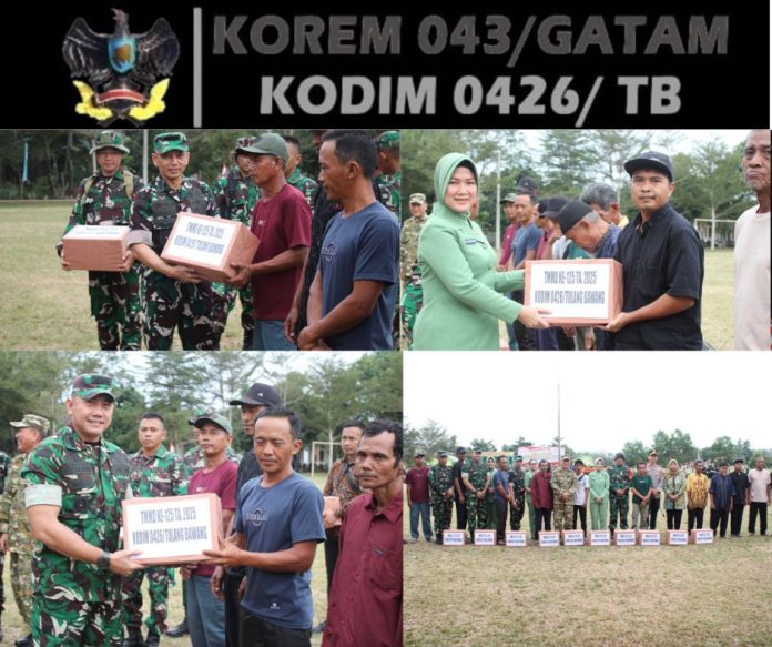 KODIM 0426/TB – – Tulang Bawang — Penutupan TNI Manunggal Membangun Desa (TMMD) ke-125 Kodim 0426/Tulang Bawang yang berlangsung di Lapangan Kampung Moris Jaya, Kecamatan Banjar Agung, Kamis (21/8/2025), tidak hanya ditandai dengan upacara resmi, tetapi juga pembagian paket sembako untuk masyarakat.