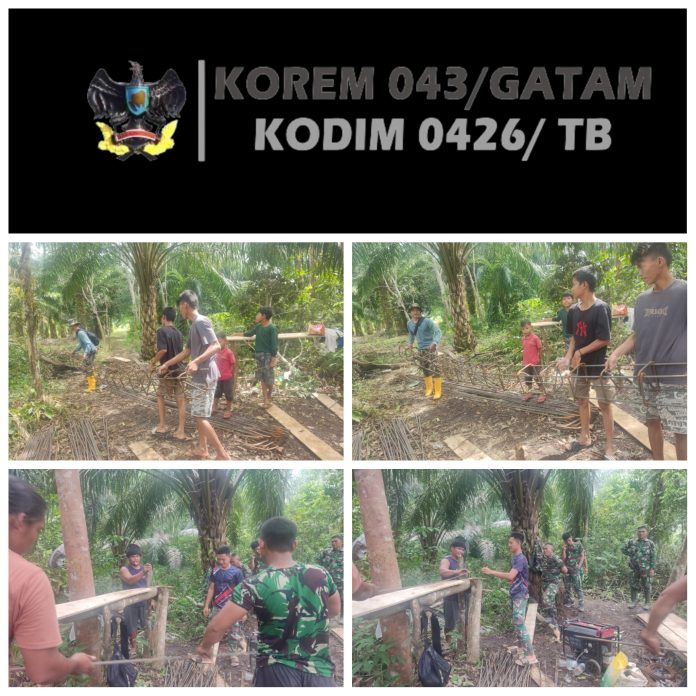 Sejumlah anggota Satgas TMMD Kodim 0426/Tulang Bawang bekerja keras untuk merakit besi-besi tersebut dengan teliti. Proses pemasangan dilakukan dengan seksama demi memastikan keamanan dan ketahanan jembatan yang akan menjadi sarana vital bagi akses masyarakat setempat.