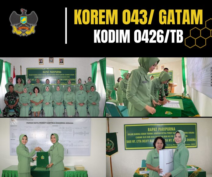 KODIM 0426/TB – – Menggala (Tulang Bawang) — Persit Kartika Chandra Kirana (KCK) Cabang XLIX Dim 0426 Tulang Bawang menggelar Rapat Paripurna dalam rangka Serah Terima Jabatan Ketua Persit KCK Cabang XLIX Dim 0426 TB, Koorcab Rem 043 PD XXI/Radin Inten.