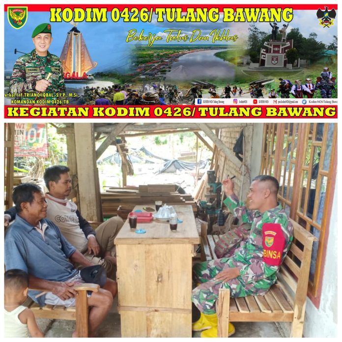 KODIM 0426/TB- Mesuji (Mesuji) — Babinsa koramil 426-01 Simpang Pematang Kodim 0426 Tulang Bawang Serda Pajriyansah melaksanakan kegiatan komunikasi sosial (Komsos) kepada warga Binaannya di Desa Wiralaga Mulya Kecamatan Mesuji, Kabupaten Mesuji Minggu 05 Maret 2023.