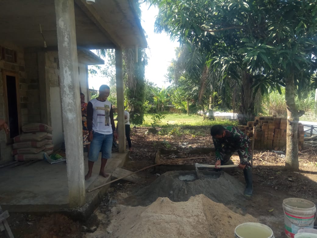 KODIM 0426/TB- MESUJI- Bertempat di rumah Amir RK 03 Desa Wira Jaya, Kecamatan Mesuji, Kabupaten Mesuji, Serda Rahmat Babinsa Koramil 426-10 Mesuji, gotong royong bantu perbaikan rumah, Senin (28/12/2020)
