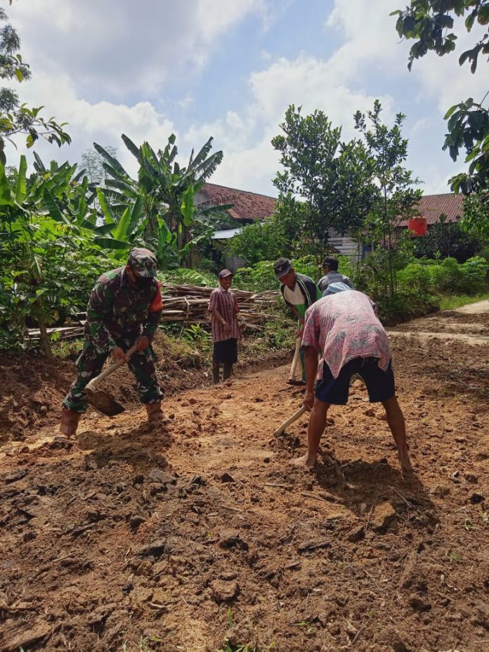 KODIM 0426/TB- BANJAR AGUNG – Serda Suranto, Babinsa Koramil 0426-04/Banjar Agung, Kodim 0426 Tulang Bawang, melaksanakan gotong royong dan komunikasi sosial membahas keamanan dan ketertiban masyarakat di Kampung Banjar Agung, Kecamatan Banjar Agung, Kabupaten Tulang Bawang, Sabtu 24 Oktober 2020.