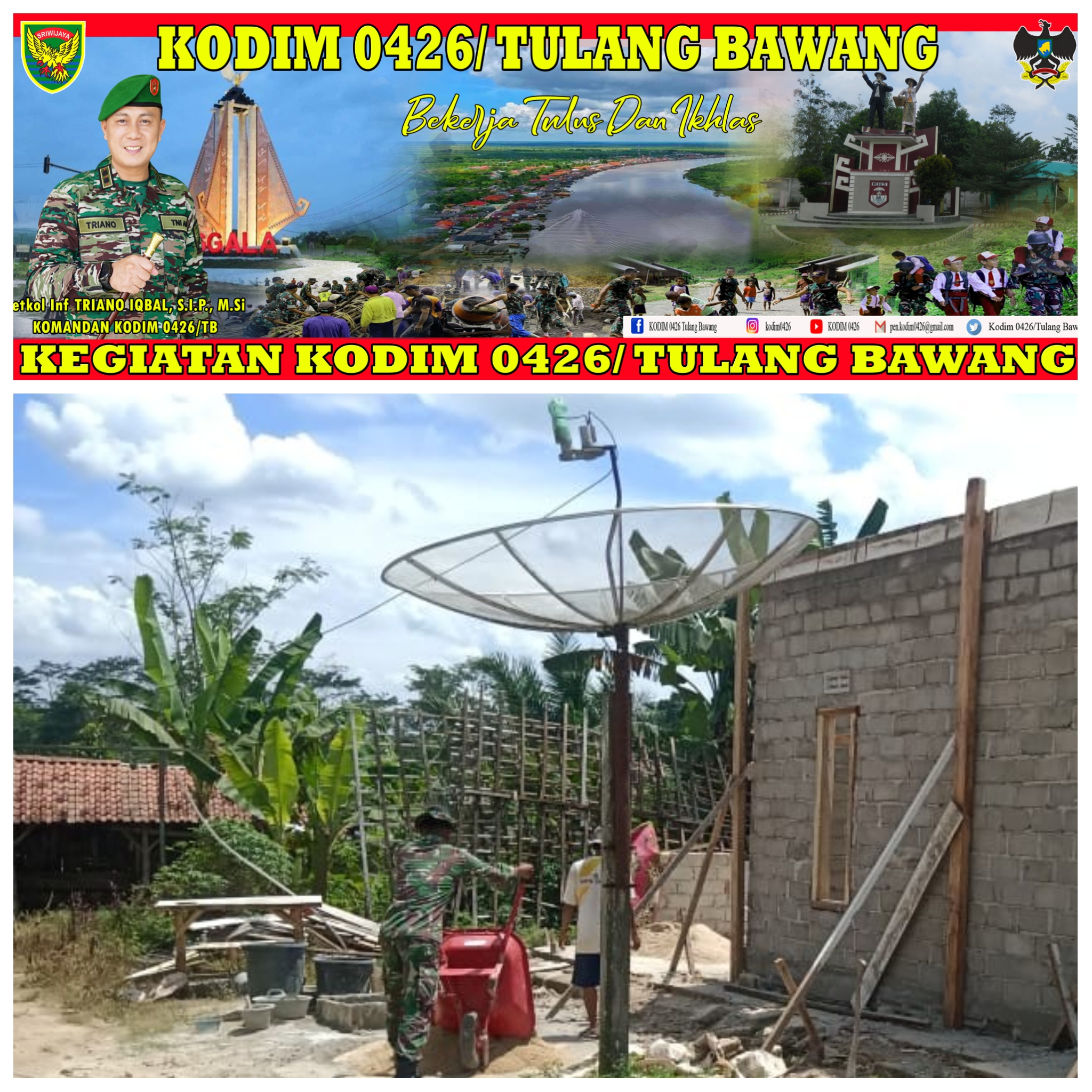 KODIM 0426/TB- Gedung Aji Baru (Tulang Bawang) – Dalam rangka menjalin kebersamaan dengan warga di desa binaan, Babinsa Koramil 426-04 Banjar Agung, Kodim 0426 Tulang Bawang, Serda Sutrino Wibowo membantu warga dalam pembuatan rumah warga di Kampung Batu Ampar, Kecamatan Gedung Aji Baru Kabupaten Tulang Bawang, Minggu 12 Maret 2023.